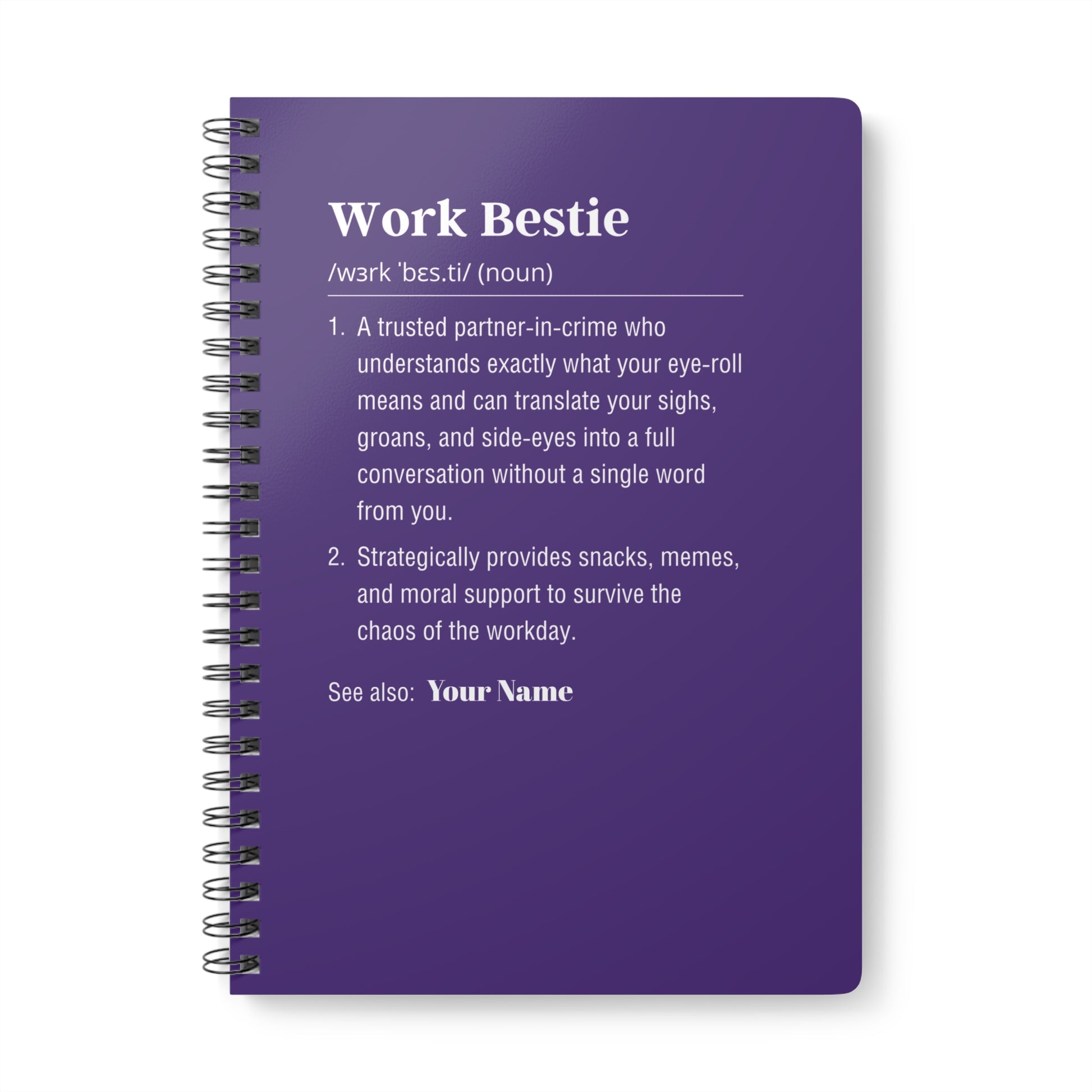 Jot down office chaos, gossip, and all your work secrets in this personalized work bestie funny definition softcover notebook. Perfect coworker gift, work secret Santa present, or daily dose of office humor in a handy A5 size!