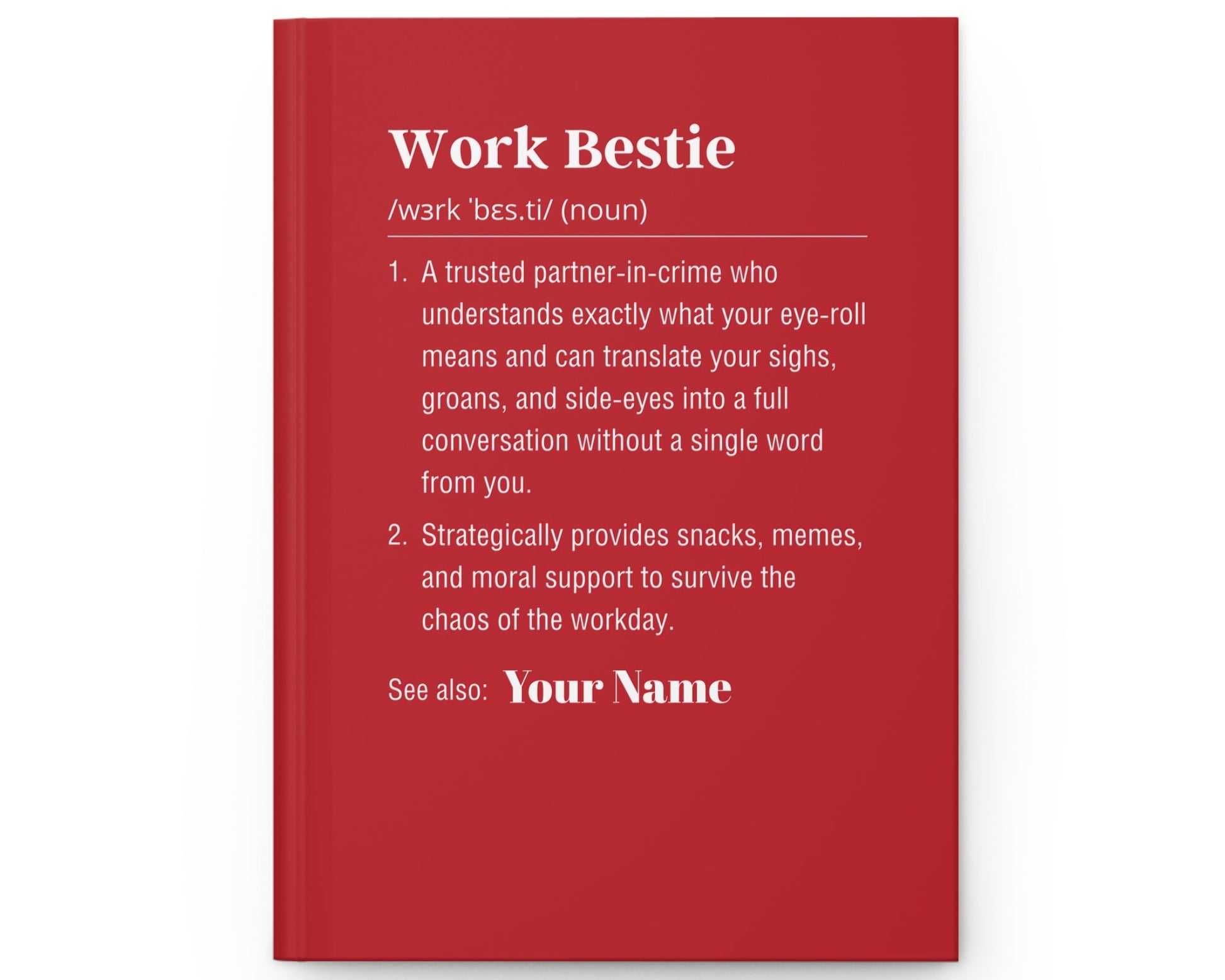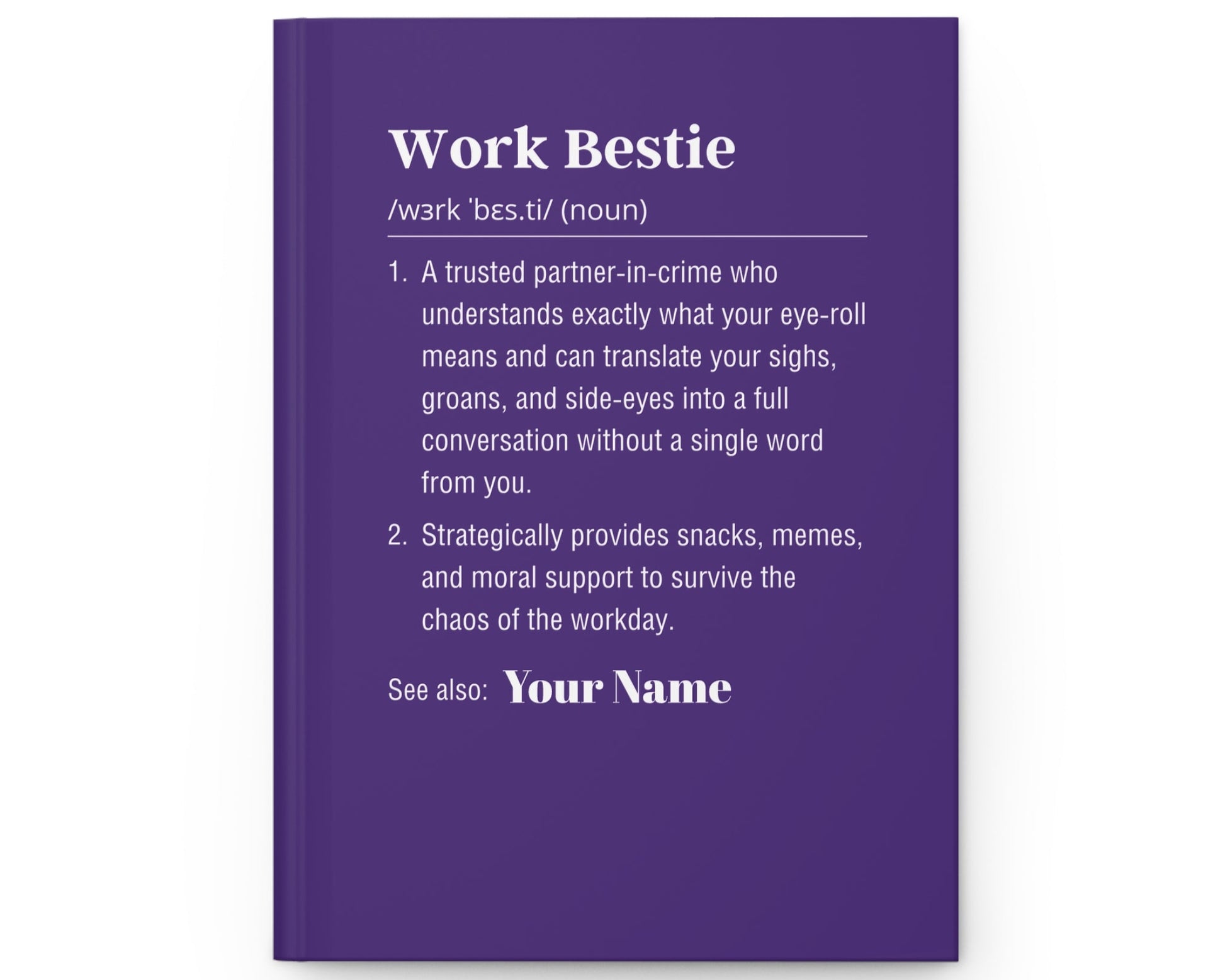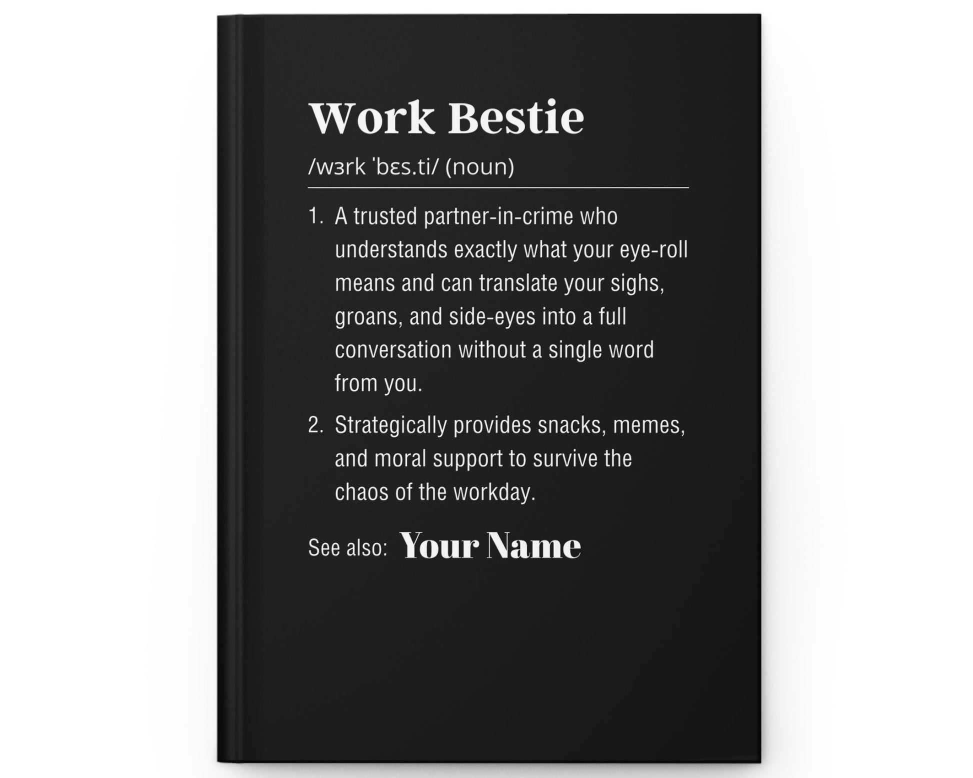Keep your office secrets and laughs safe with this personalized work bestie hardcover journal. Perfect coworker gift, work secret Santa present, or just a daily dose of office humor. Ideal for jotting down chaos, gossip, and corporate shenanigans!